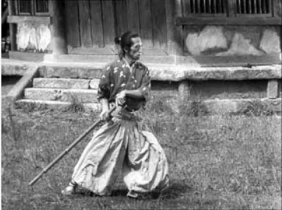 最初の侍官兵衛(志村喬)の出現シーンは実に多くのエキストラを使った力の入ったものとなっています。多くの人々の移動、にぎりめしをもって走ってくる一人の女の移動など多と一人という構図が交差的に重ねられています。そして人質をとって立てこもった男の最後はスローモーションで非常に強い印象を残すように作っています。