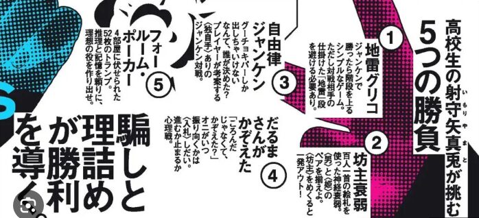 以下百人一首での「坊主めくり」変形ゲーム、ジャンケン変形ゲーム、「だるまさんがころんだ」変形ゲーム、「ポーカー」変形ゲームと趣向を変えながら、主人公真兎の驚異的な観察力・思考力・戦略で次々に強敵を打ち負かしていく知的爽快感が味わえる一冊です。